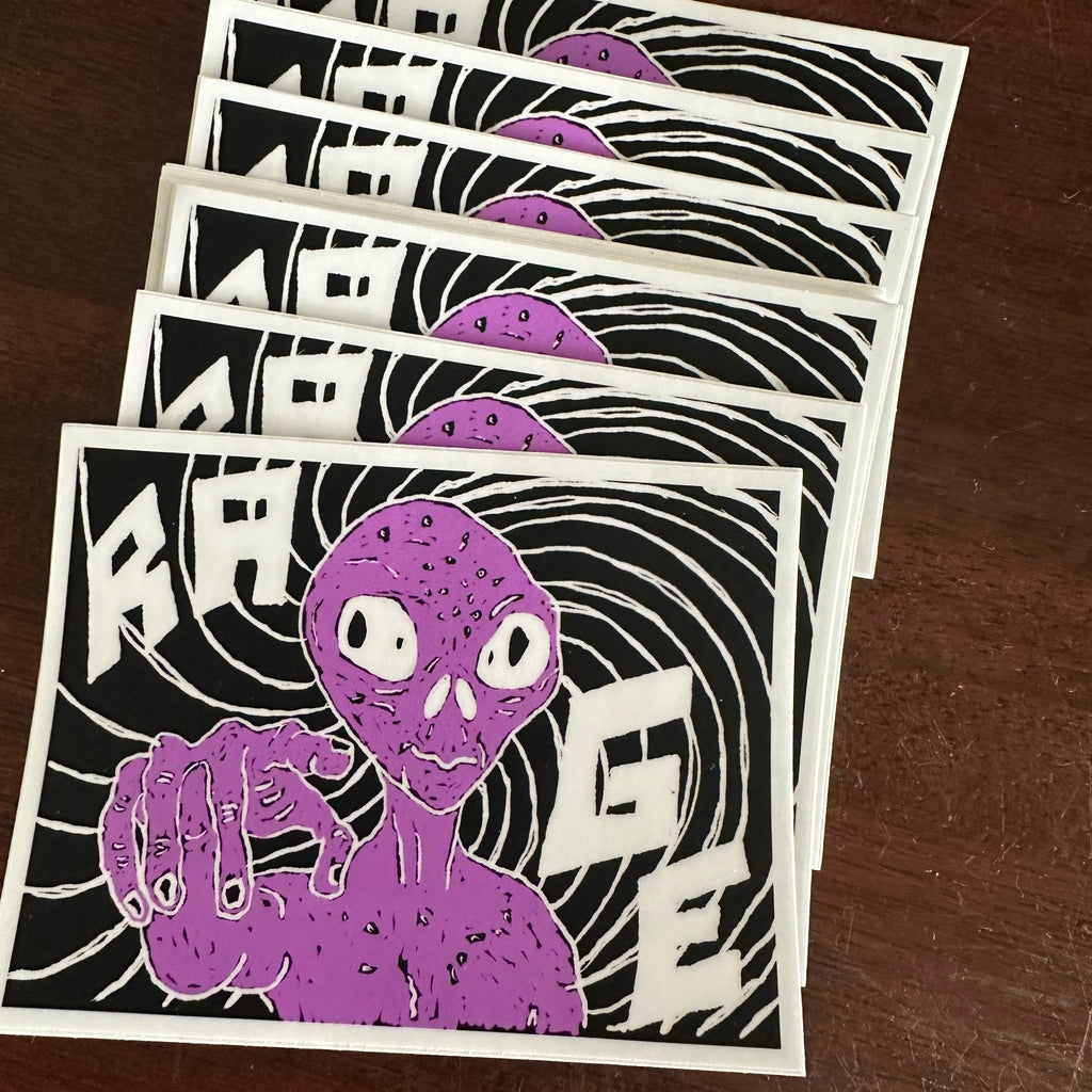 Limited run of RAGE Alien tees, hand screened in Byron Bay on comfort colours blanks. Art by Creed.